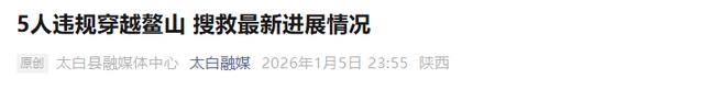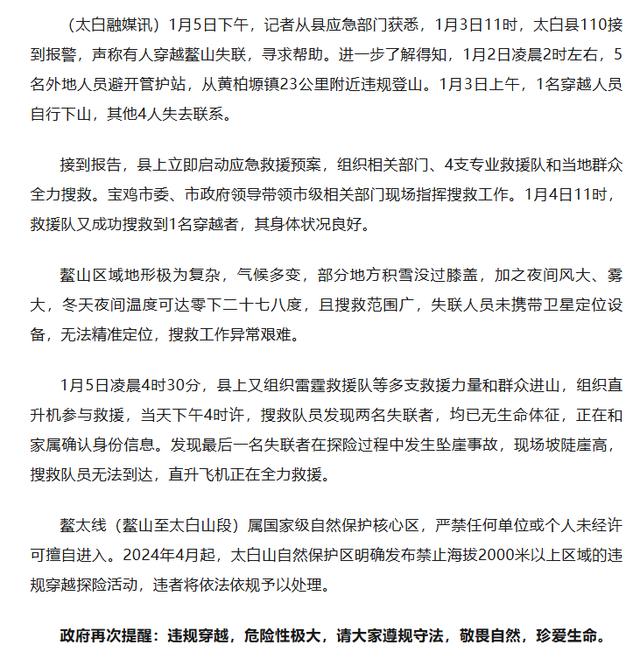 1月5日深夜,“太白融媒”微信公众号通报,5人违规穿越鳌山,搜救最新进展情况公布: