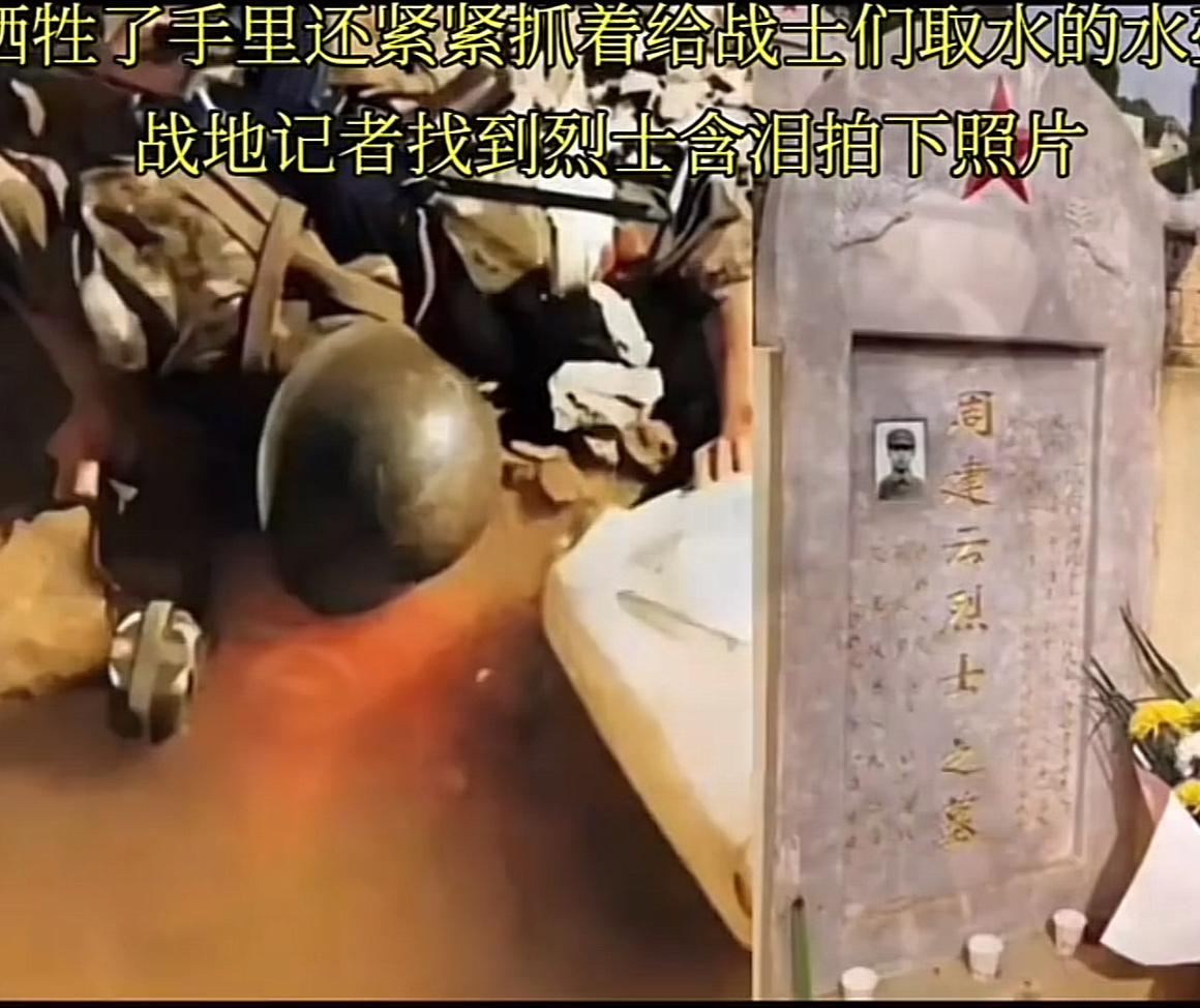 这是一张战地记者找到烈士含泪拍下的照片,老山战士周建云他自告奋勇下山,为阵地战友冒死溪边取水瞬间,被越军狙击手狙中头部,倒在了溪水边。头部的血染红的溪水,牺牲了手里还紧紧地抓着给战友取水的水壶! 周建云烈士1965年人,云南省昆明市寻甸县,1984年1月入伍,原14军40师119团战士,1984年5月1日在老山前线为战友取水时,不幸被潜伏的越军狙击手射杀,牺牲时19岁。 危险无处不在,老山战地水难求,有时狠毒的越军还往水沟里下毒,不知道有多少战士为了水而牺牲了性命。就是在这种艰难的情况下,战士们仍然一往无前,英勇作战,他们才是最可爱的人。 向英雄致敬!麻栗坡,老山精神!