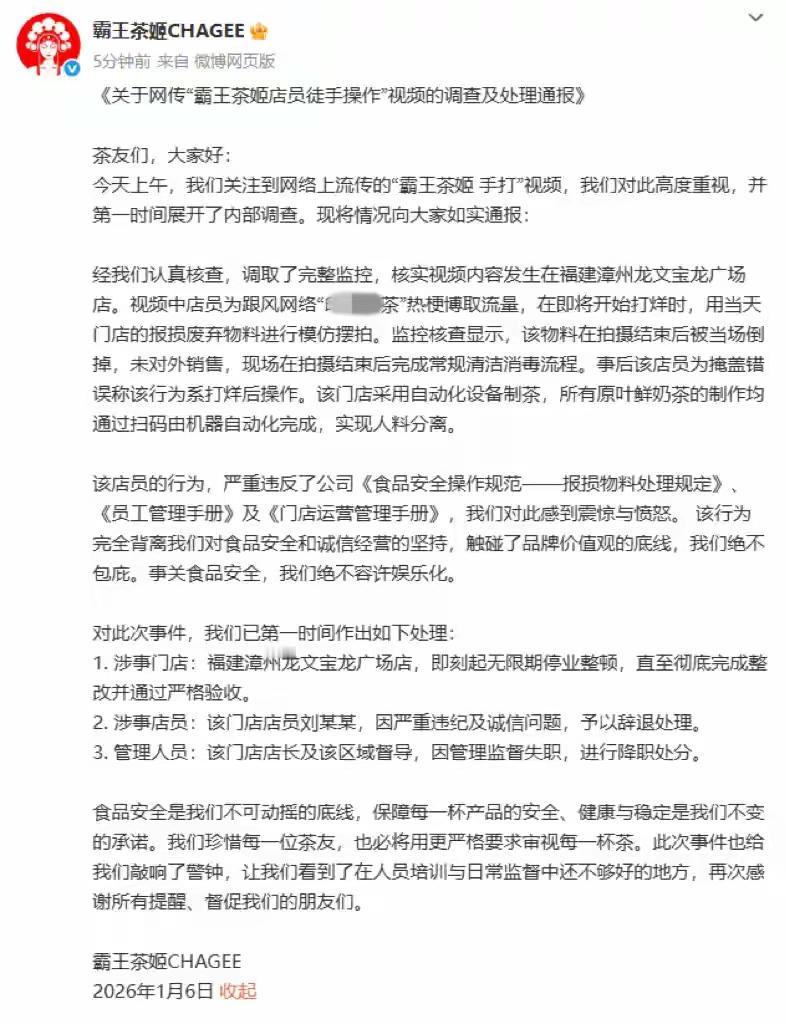 这样的奶茶你还会买吗?徒手挤柠檬,手伸进杯搅打,洒落桌面饮料回收进杯……霸王茶姬“手打奶茶”视频震惊网友。1月6日,霸王茶姬因“手打奶茶”登上热搜,引发轩然大波。网传视频显示,一名身穿霸王茶姬工服的员工在制作饮品过程中,未佩戴手套,徒手捏挤柠檬片或橙片等夸张操作,让视频极具视觉冲击。今天,霸王茶姬发布通报称,该视频内容发生在福建漳州龙文宝龙广场店。涉事门店已停业整顿,店员予以辞退。 评:霸王茶姬的食安危机从不是孤例,而是高速扩张下的必然失守。徒手捏柠檬、摆拍“脏操作”,暴露门店管理形同虚设;咖啡因含量偷换概念、实际值远超标注,是对消费者知情权的漠视;反式脂肪酸争议与茶多酚信息暗撤,更显健康营销的虚伪。食安无“摆拍”“合规擦边”之说,加盟模式的松散管控、标准滞后下的刻意模糊,终究难掩责任缺位。新茶饮的竞争,从来不该是开店速度与营销噱头,而是守住每一杯饮品的安全底线。社会热点 霸王茶姬“手打奶茶”事件 食品安全最新事件