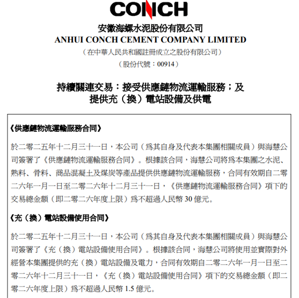 此外,海螺水泥还与海慧公司签署了《充(换)电站设备使用合同》。根据该合同,海慧公司将使用并实际对外经营集团提供的充(换)电站设备及电力,合同有效期自2026年1月1日至2026年12月31日,交易总金额不超过1.5亿元。