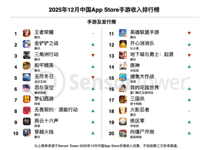 腾讯《王者荣耀》、《金铲铲之战》、《三角洲行动》与《和平精英》包揽本期中国AppStore手游收入榜TOP4。