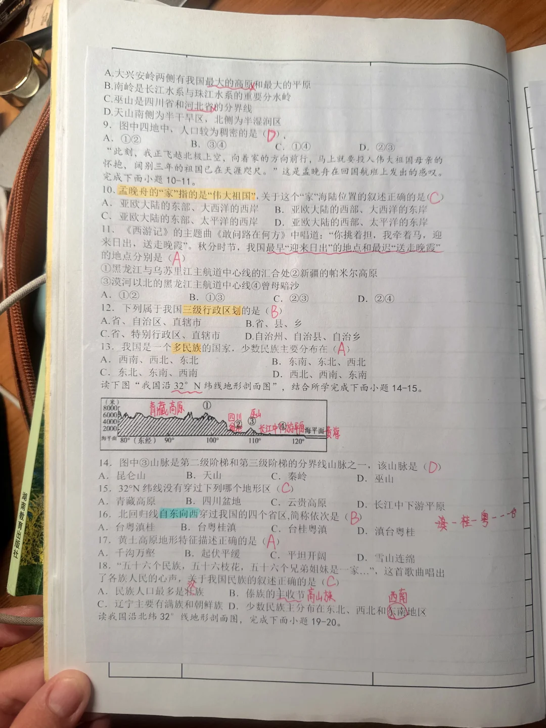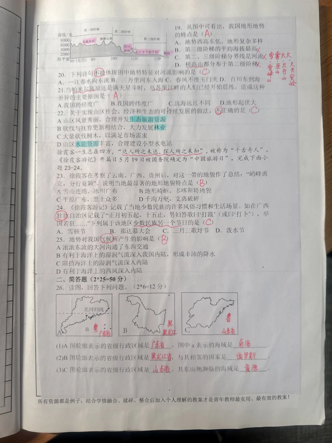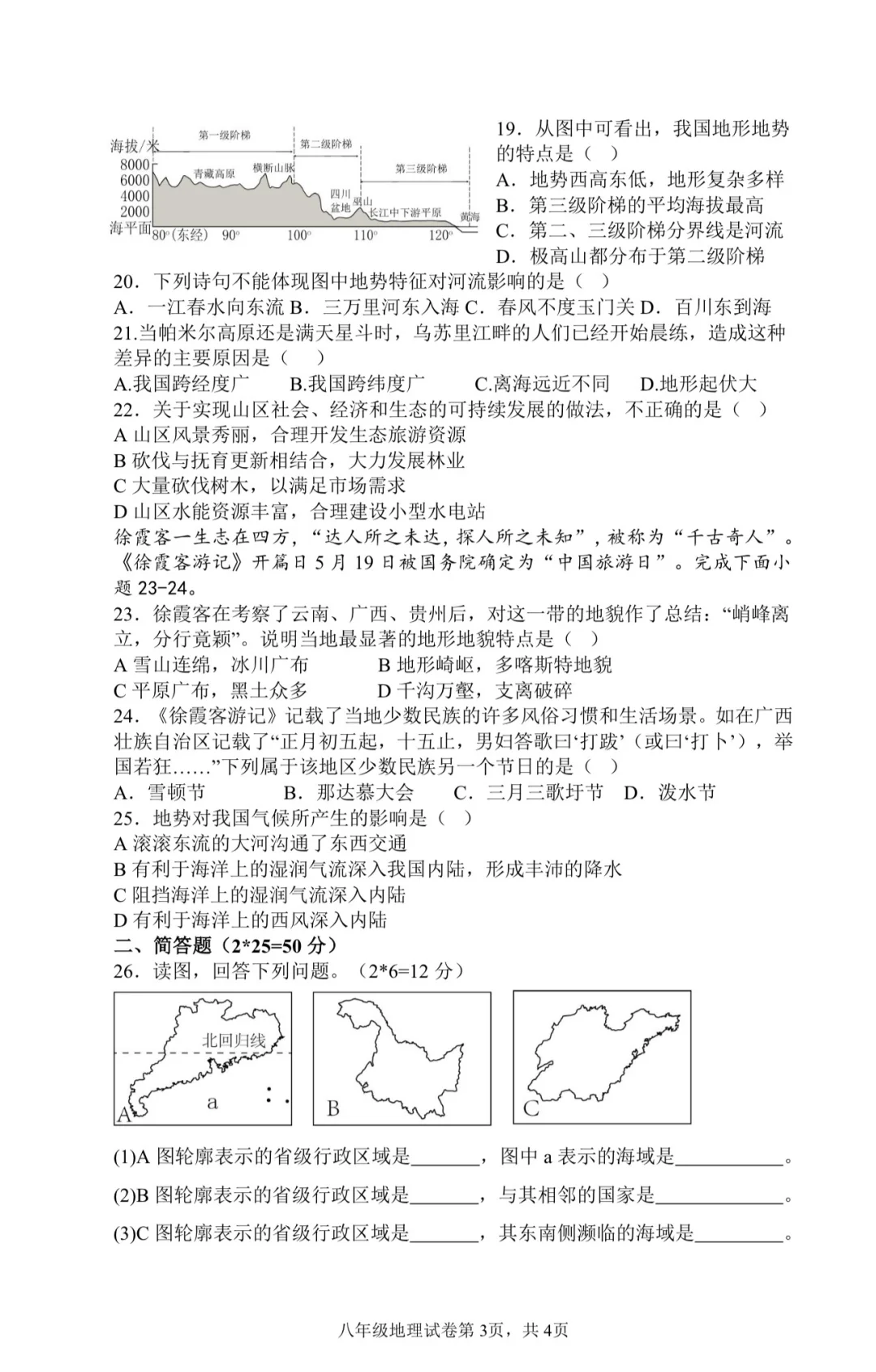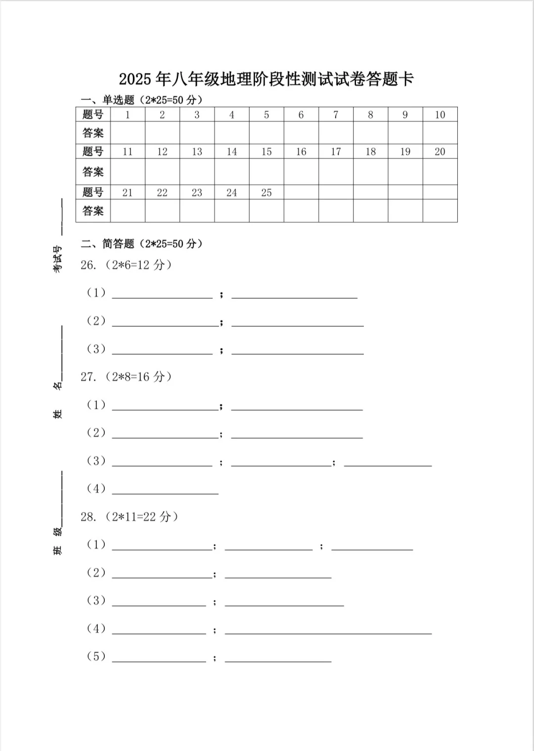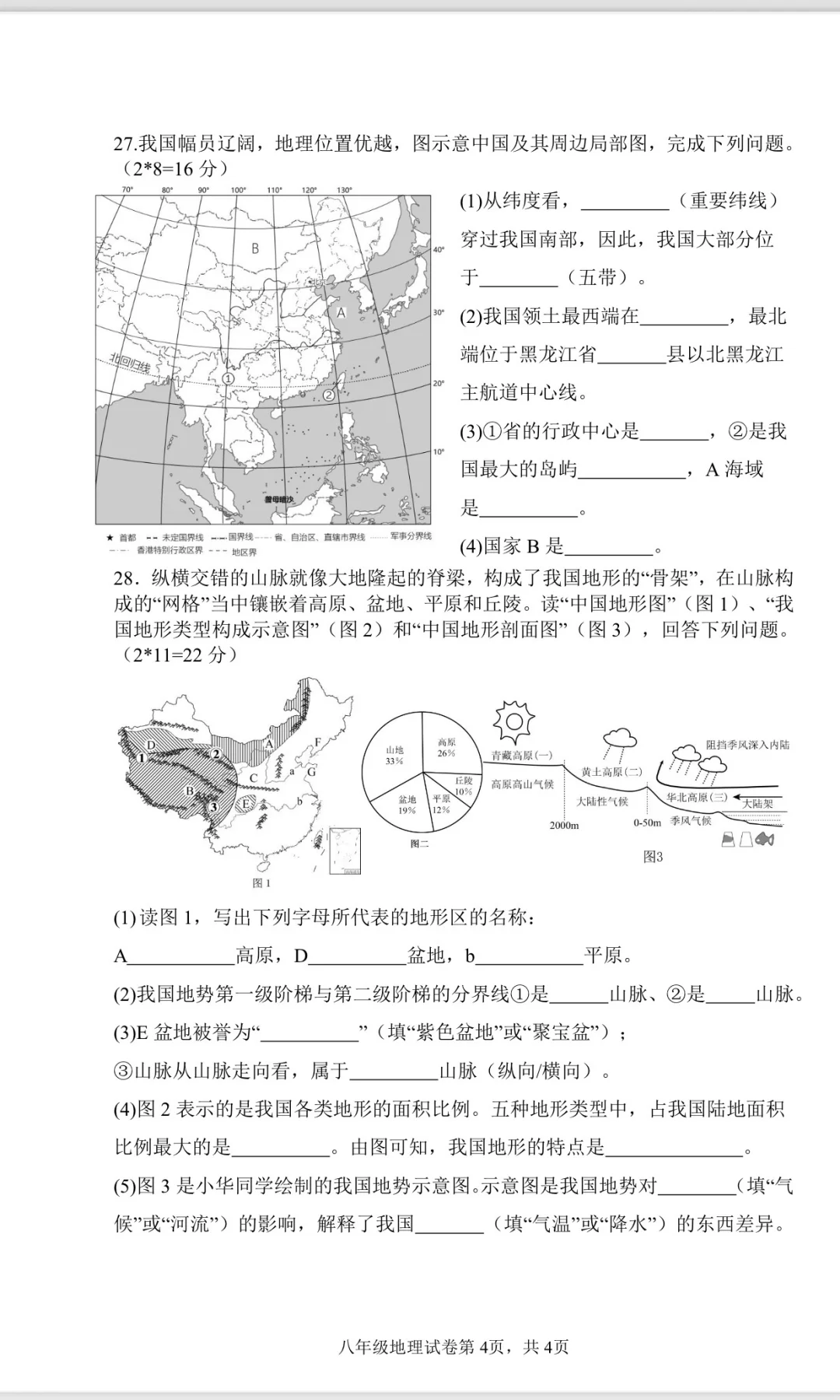 国庆之前出的八年级湘教版地理阶段性测试试题,总分100分。学校安排10月10日统一全学科测试,原本计划给的时间是1个小时,后来史地生郑是30分钟一科,试卷我没有做调整,直接用的,感觉时间也够。 我自认为试卷很简单,从老师的角度,但是从考完的反应来说并不好,学生普遍反应难,我就纳闷了,到底哪里难[叹气R][叹气R][叹气R]emo好久 这次地理试卷全校八年级普通班来说合格率最低,实验班来说优秀率也低。恳请地理老师们帮我看看问题所在,下次积极改正。