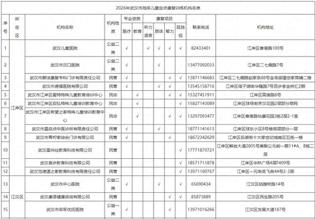 1月4日,武汉市残疾人联合会网站发布2026年武汉市残疾儿童定点康复训练机构名单,武汉儿童医院等65家机构入选,具体名单如下: