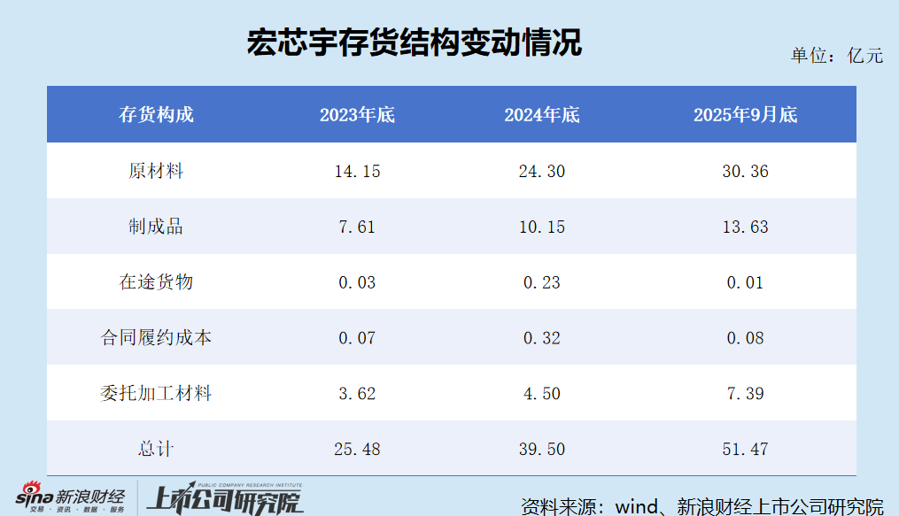 具体到存货,截至2025年9月底,宏芯宇库龄在3个月内的存货余额为30.29亿元,较年初增长53.60%,占总存货的比重高达58.85%,同比上升8.92pct。也就是说,宏芯宇在短期内囤积了大量货物,且主要为原材料和制成品。