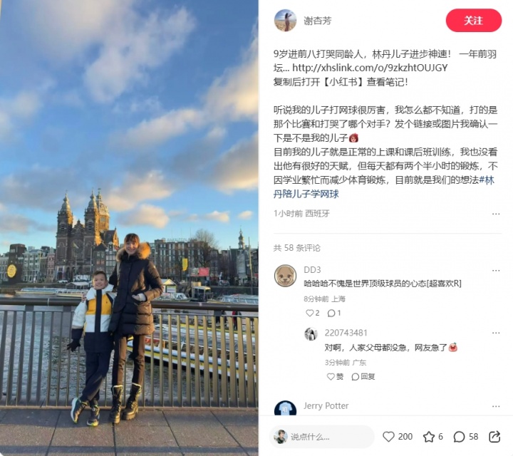 谢杏芳附上了报道原文并表示:听说我的儿子打网球很厉害,我怎么都不知道,打的是那个比赛和打哭了哪个对手?发个链接或图片我确认一下是不是我的儿子。