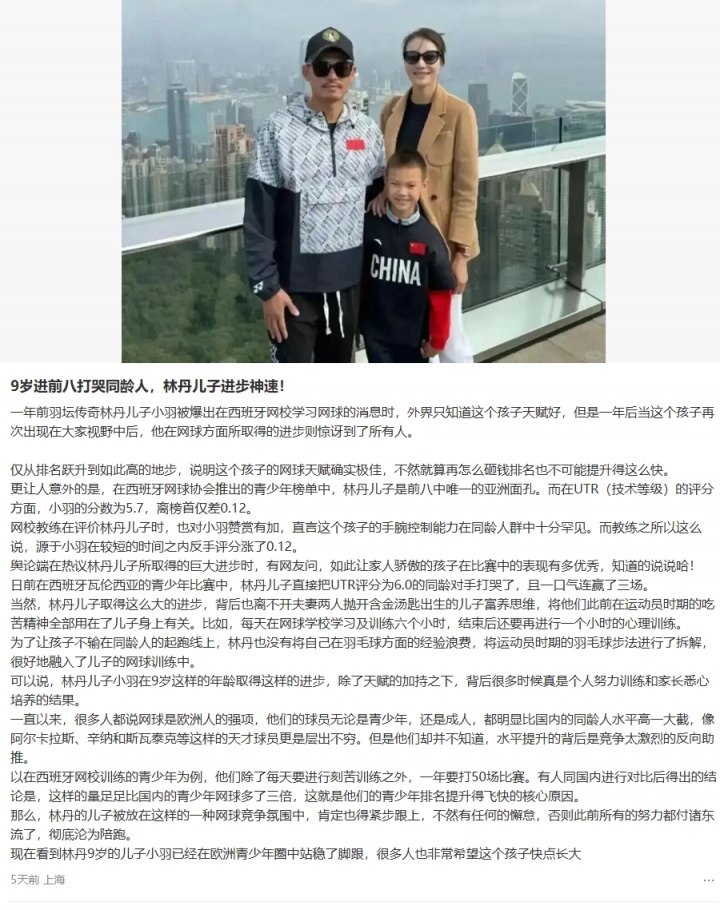 直播吧01月06日讯近日有自媒体称林丹和谢杏芳的儿子9岁网球进前八打哭同龄人,今日谢杏芳做出了辟谣。