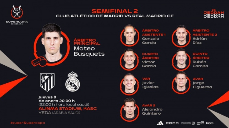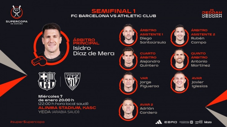 直播吧1月6日讯西班牙足协公布了西超杯的裁判安排,德·梅拉执法巴萨vs毕巴,马特奥·布斯克茨执法皇马vs马竞。