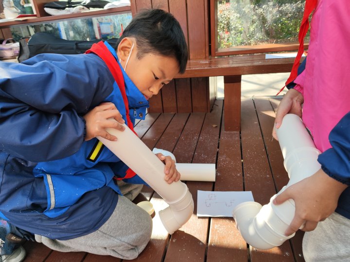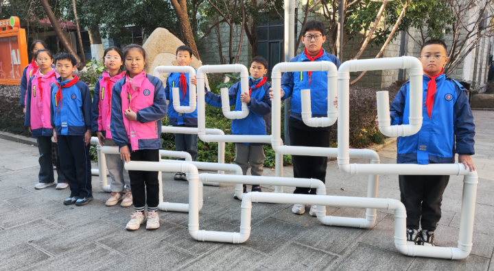 第一次失败后,大家聚在一起讨论,最后定下用塑料管来制作。同时为了践行环保理念、减少浪费,同学们在正式裁切前反复测算、精心绘制设计草图,力求将材料损耗降至最低。
