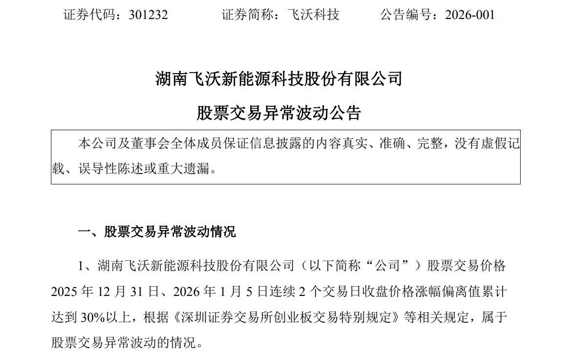 1月5日晚间,湖南飞沃新能源科技股份有限公司(证券简称飞沃科技)发布公告称,公司股票交易价格连续两个交易日收盘价格涨幅偏离值累计达到30%以上,属于股票交易异常波动的情况。这已是自2025年12月1日以来,飞沃科技股价累计暴涨超210%后,公司发布的第三份股价异动公告。