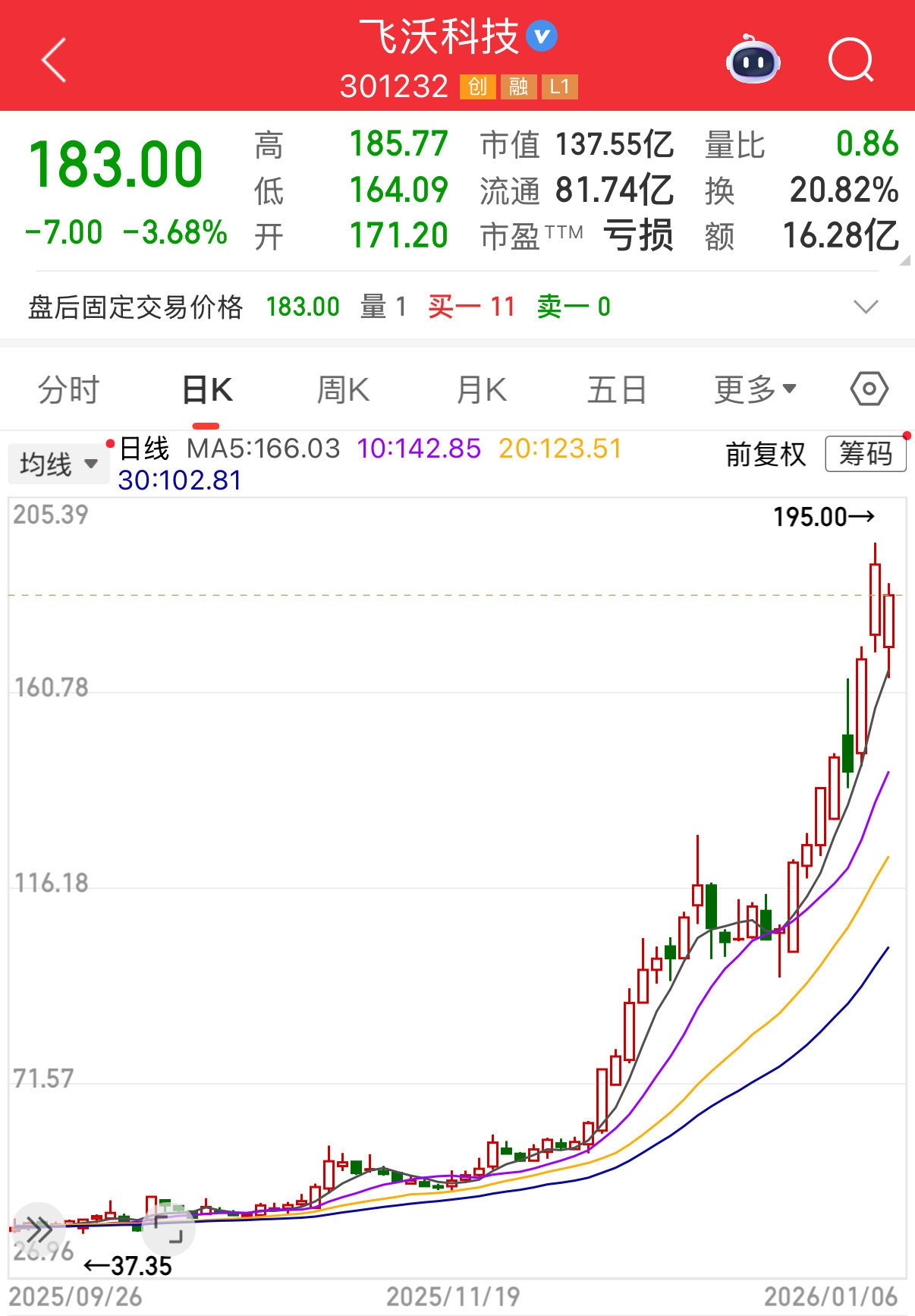 截至1月6日收盘,飞沃科技下跌3.68%,报183元/股,总市值137.55亿元。