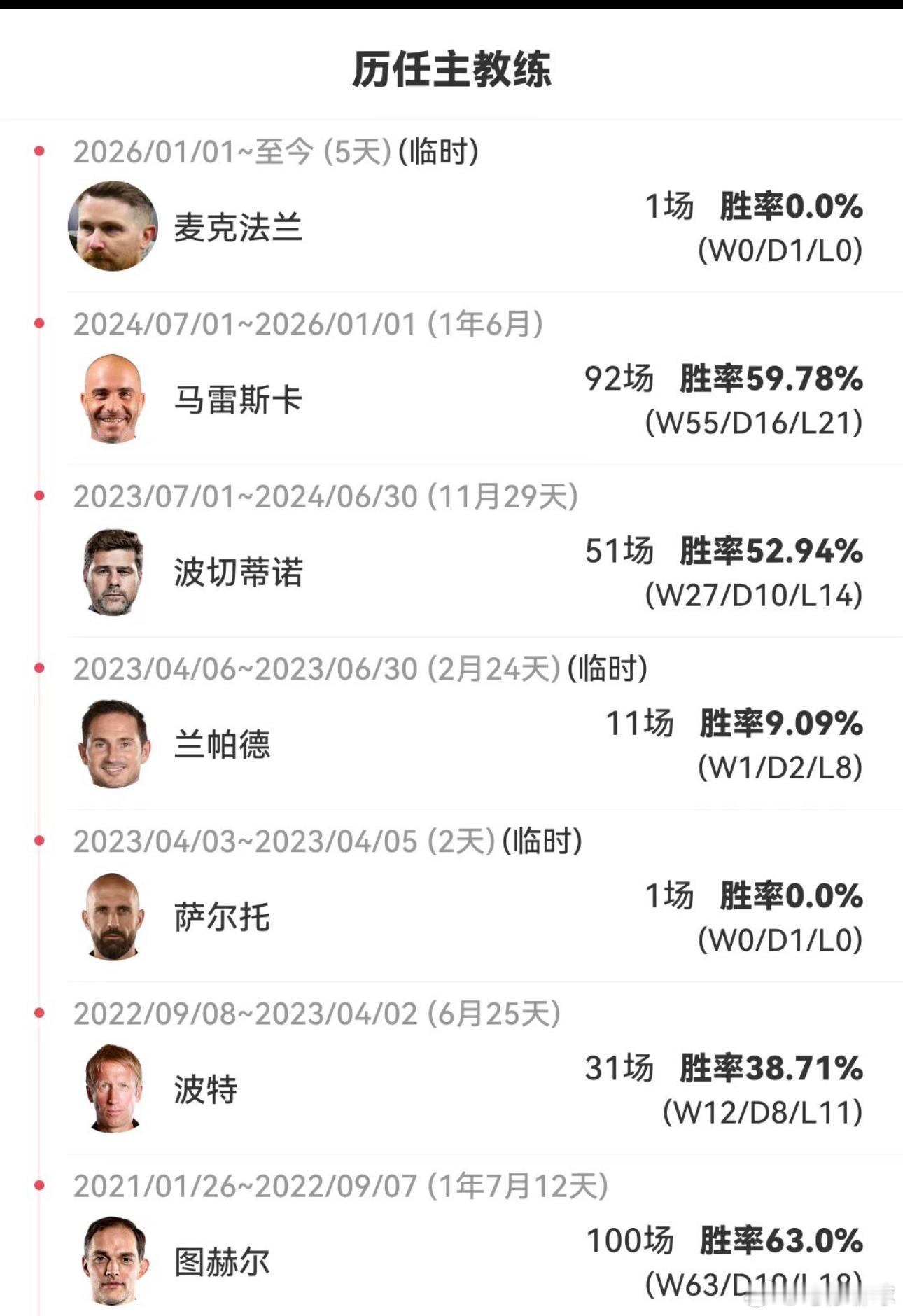 1月6日讯 随着切尔西官宣罗森尼尔上任并签约至2032年,蓝军迎来了伯利时代的第5位正式主教练。2022年5月,伯利牵头的财团(后更名为BlueCo)完成收购切尔西。在仅仅4个月后,带队夺得欧冠的功勋教头图赫尔就黯然下课。据统计,算上刚刚上任的罗森尼尔,在伯利任上共历经了5任正式主帅,若算上临时主帅,已经有8人之多。在这5人中,无一人在其执掌切尔西时执教超过百场(图赫尔的百场包括在阿布执掌切尔西时期的战绩),其中马雷斯卡的1年半时间已为最长,波特、波切蒂诺均未带队超过一年时间。切尔西切尔西官宣马雷斯卡下课切尔西
