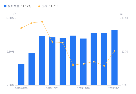 日期A股户数(户)流通A股户均持股数(股)户均持股市值(万元)2025-12-3111117710876.9112.782025-12-1910908711085.3112.142025-12-1010908710391.9211.612025-11-2810487910602.2811.732025-11-2010704510387.7511.422025-11-1010538310346.2012.612025-10-3110578710306.6912.612025-10-2010688910200.4313.592025-10-109422511571.3915.332025-09-308615812654.8216.41