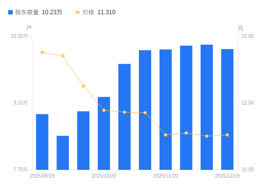 日期A股户数(户)流通A股户均持股数(股)户均持股市值(万元)2025-12-3110609117384.1020.032025-12-1910232318024.2620.392025-12-1010324417863.4720.112025-11-2810304717897.6220.372025-11-2010225718035.8920.402025-11-1010209618064.3321.932025-10-319920418590.9422.612025-10-209228419985.0024.442025-10-108927020659.7527.152025-09-308412021924.5831.29