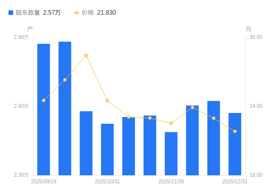 日期A股户数(户)流通A股户均持股数(股)户均持股市值(万元)2025-12-31257115597.8012.222025-12-19262385485.3612.602025-12-10260395527.2913.222025-11-28248805784.7713.032025-11-20256055620.9712.922025-11-10255355636.3813.002025-10-31252475700.6813.972025-10-20257905580.6515.872025-09-30288184994.2713.142025-09-19287245010.6212.29