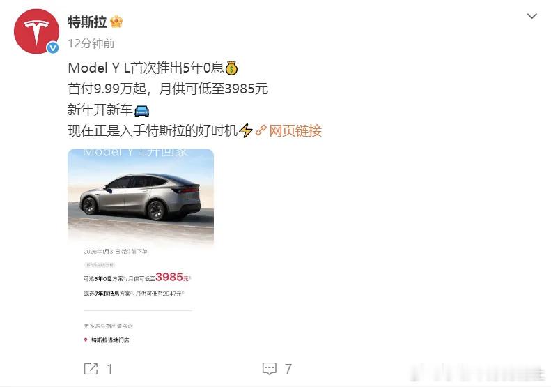 特斯拉中国:特斯拉购买Model 3和Model Y、Model Y L车型5年0息
