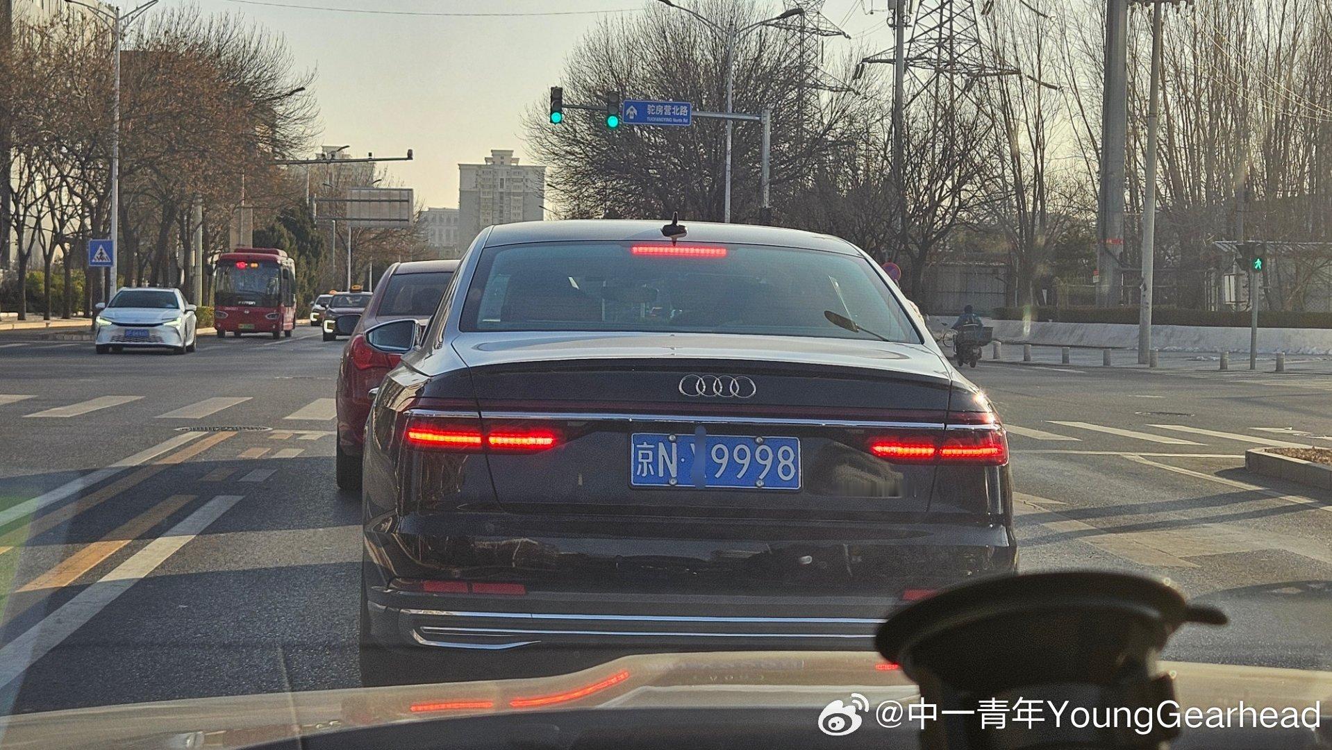 路上偶遇奥迪A8L霍希,看车型以为开车的是刘德华,看车牌以为是教父,跑到正面一看