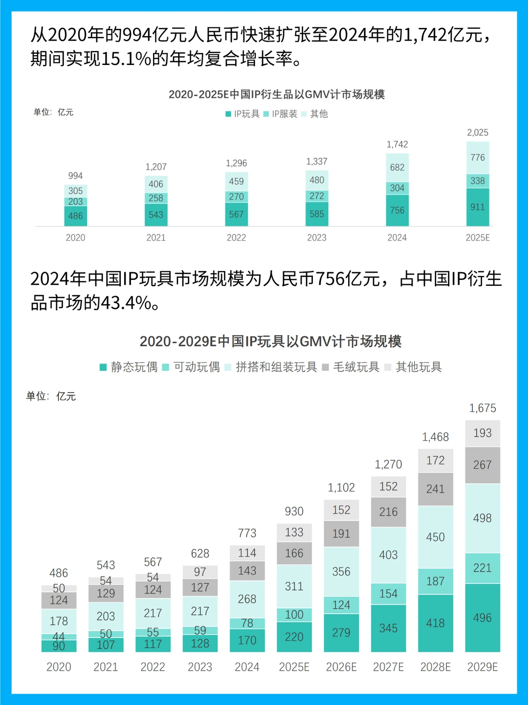· IP衍生品总盘:2024年达1,742亿元(CAGR 15.1%),2025年预计2,025亿元。