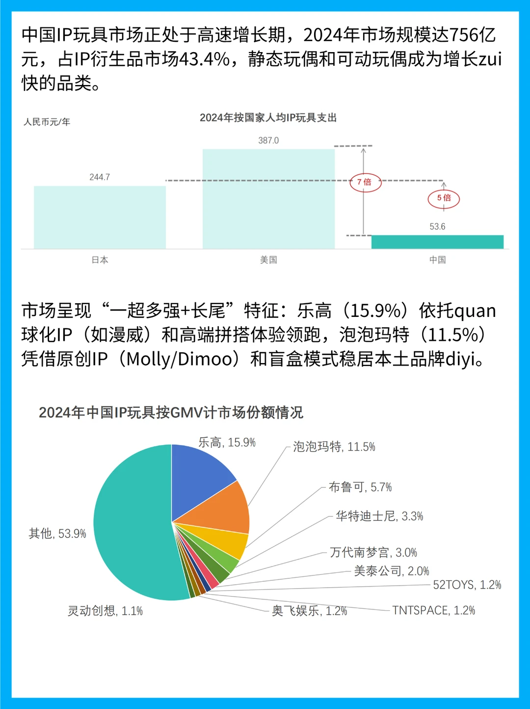 · 市场份额:乐高15.9% + 泡泡玛特11.5%(合计不足30%),其他品牌占53.9%(整合空间大)。