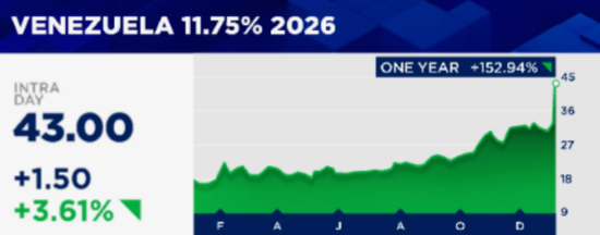 该国2026年10月到期的基准债券价格已涨至每1美元面值对应约0.43美元,较去年8月翻倍。此番上涨的背景是,尼古拉斯・马杜罗总统意外被罢免,同时美国政策调整为委内瑞拉债务重组打开了潜在空间,交易员因此重新评估了这批困境债券的追偿前景。
