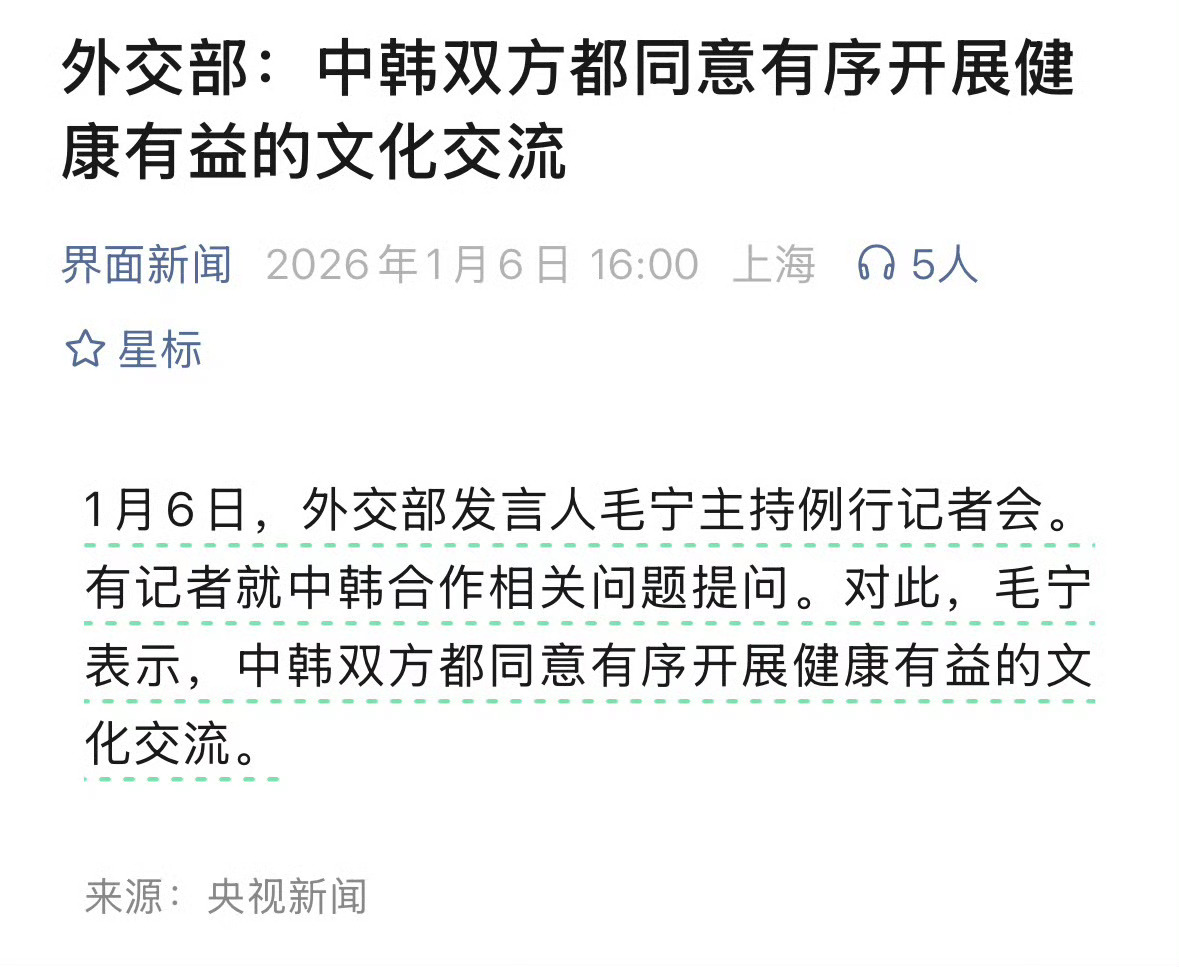 260106韩媒报道,今日中国外交部发言人对中韩文化交流问题做出回应Q:中国是否欢迎来自韩国更多的文化输入?A:中韩都同意有序展开健康有益的文化交流Q:去年接连出现演出延期、取消A:中国对中韩双方开展健康有益的文化交流没有异议