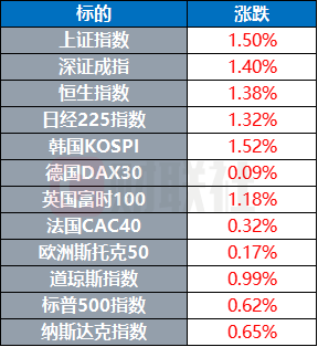欧洲主要股指多数收涨,欧洲斯托克50指数涨0.17%,英国富时100指数涨1.18%,法国CAC40指数涨0.32%,德国DAX30指数涨0.09%。