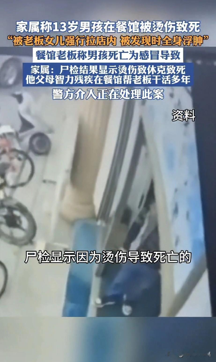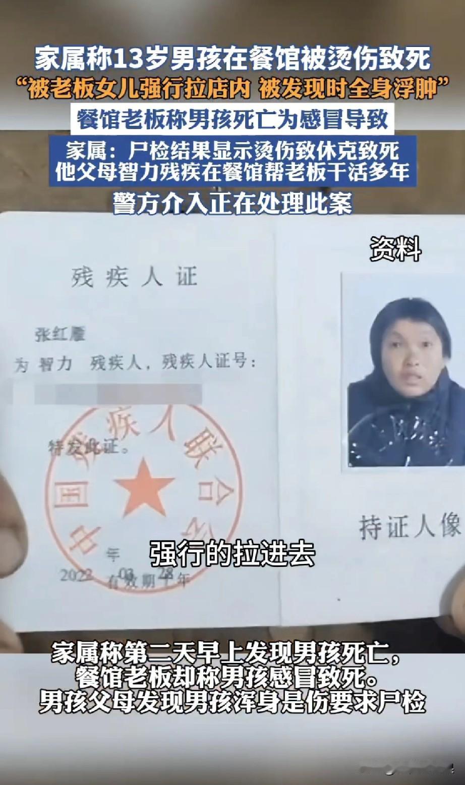 汕头一对智力残疾夫妇在餐馆干了14年,唯一的13岁儿子被老板女儿强行拉进店后,竟被烫伤活活疼死!更气的是,老板还撒谎说孩子是感冒死的,更过分的是,这起惨案拖了三年,涉事方居然还拆监控、改店名,让这对爸妈连维权都走投无路! 这对父母叫张红雁夫妇,都是智力残疾二级,没啥文化,就只会埋头在餐馆干活,一心想给唯一的儿子攒点钱。2023年1月9号那天,张子轩在餐馆门口玩,不想被老板女儿拽着,他想跑,结果被硬生生拉进店里。谁能想到,这一拉就再也没出来。第二天早上,爸妈发现儿子浑身肿得厉害,身上全是烫伤,人早就没气了,可老板却轻描淡写说“孩子是感冒死的,别声张”。 看着儿子身上的伤,这对残疾爸妈再笨也知道不对,哭着喊着要给孩子做尸检。结果出来后,真相让人心碎:孩子是因为四肢被烫伤,引发挤压综合征和急性肾衰竭,最后休克死的,跟感冒半毛钱关系都没有!可真相摆在眼前,涉事的餐馆却开始耍手段——监控连夜被拆了,关键画面全没了;店铺还改了两次名字,连工商信息都注销了,老板一家人更是直接躲起来,连面都不露。 这三年里,张红雁夫妇拿着残疾证和尸检报告,一次次跑派出所、找相关部门,可每次得到的都是“先登记”“正在处理”的话。他们连完整说清楚诉求都费劲,更别说跟涉事方掰扯、走复杂的维权流程了。孩子的遗体现在还躺在殡仪馆,没能入土为安,而那家人却跟没事人一样,这事儿想想就憋得慌! 在我看来,这事儿最让人寒心的,不是孩子的惨死,而是弱势群体被欺负到骨子里的无助。这对爸妈是残疾人,在餐馆干了14年,没功劳也有苦劳,可孩子没了,他们连最基本的公平都摸不着。涉事方敢这么嚣张,就是觉得这对夫妇好欺负;而案件拖了三年不立案,相关部门的拖延,更是让这对爸妈的希望一点点破灭。 咱们总说法律面前人人平等,可对张红雁这样的残疾家庭来说,想要讨个公道咋就这么难?他们不要别的,就想知道孩子到底咋死的,让害人的人受到惩罚。真心希望相关部门能真的上心,把这事儿查清楚,给这对可怜的爸妈一个交代。毕竟,就算是弱势群体,他们的孩子也是一条命,也该被好好对待啊! 希望法律给这对可怜的爸妈和孩子一个公道!