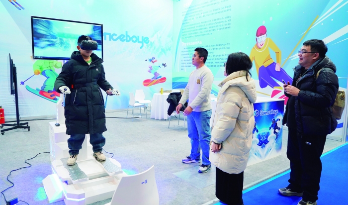 在第九届吉林冰雪产业国际博览会上,一名少年站上模拟滑雪机,佩戴VR设备沉浸式体验虚拟滑雪的乐趣。