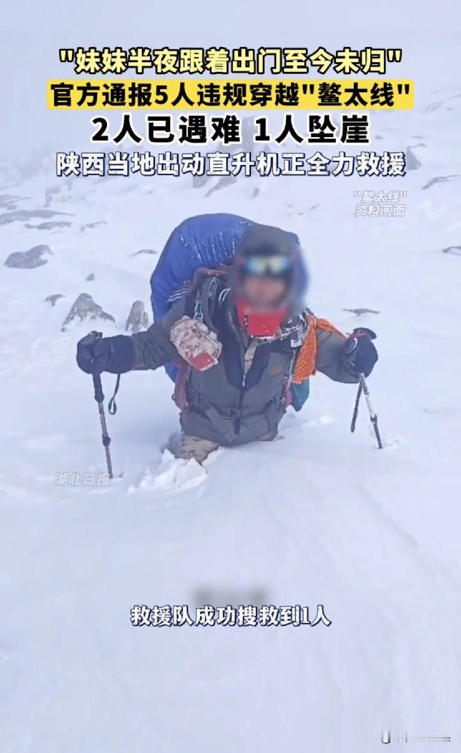 真的离谱,5个人元旦非要去闯鳌太线,结果现在2个人没了,1个人坠崖,就这还没带帐篷打算一天穿完,简直是拿命开玩笑! 这事儿发生在1月1日晚上,5名驴友钻进秦岭“小鳌太线”徒步,进去没多久就彻底失联了。直到1月3日凌晨,才有1个人因为身体扛不住先下山了,脚冻伤了但没啥大碍。到1月4日早上,又有1个驴友侥幸走下山,当地都出动直升机搜救了,1月5日发现2名失联者无生命体征,1名失联者坠崖,直升机还在全力救援。 更让人咋舌的是,知情人说他们居然准备“一日速穿”,连帐篷都没带!咱都知道鳌太线有多凶险,前五年就有46个驴友在这儿失踪或丧命,冬天零下几十度的天,没帐篷在野外待一晚,根本就是往鬼门关里钻。 2018年就明令禁止穿越鳌太线了,可总有人觉得自己是例外,不带够装备就敢硬闯。害得救援人员还在冰天雪地里拼命找,也希望这次的事能让那些心存侥幸的人彻底清醒!户外玩归玩,别跟自然较劲,更别违反规矩。拿生命换所谓的“探险”,真的不值当!