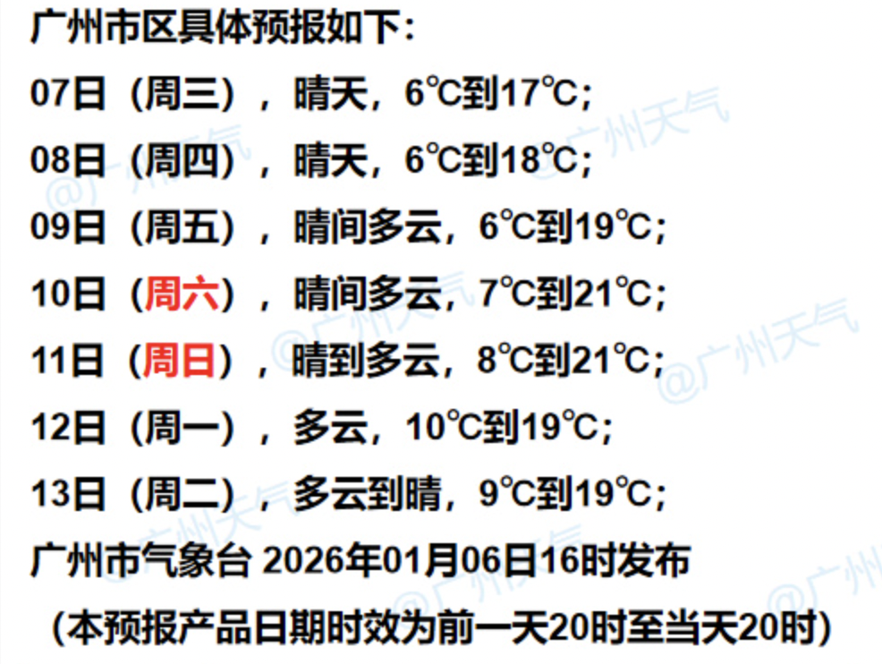 7日,广东省大部晴,昼夜温差大,早晚寒冷。最低气温:粤北、珠三角北部市县1℃~5℃,其中高海拔山区零下4℃~0℃,有霜冻和冰冻,湛江10℃~14℃,其余市县6℃~9℃。