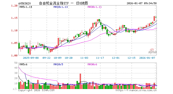 自由现金流全指ETF(563620)业绩比较基准为中证全指自由现金流指数收益率,管理人为兴业基金管理有限公司,基金经理为张诗悦、徐成城,成立(2025-08-06)以来回报为15.65%,近一个月回报为3.16%。