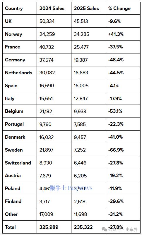 据electrek报道,特斯拉2025年欧洲全年销量数据已出炉,该品牌在欧洲多数主力市场的表现堪称全面溃败。