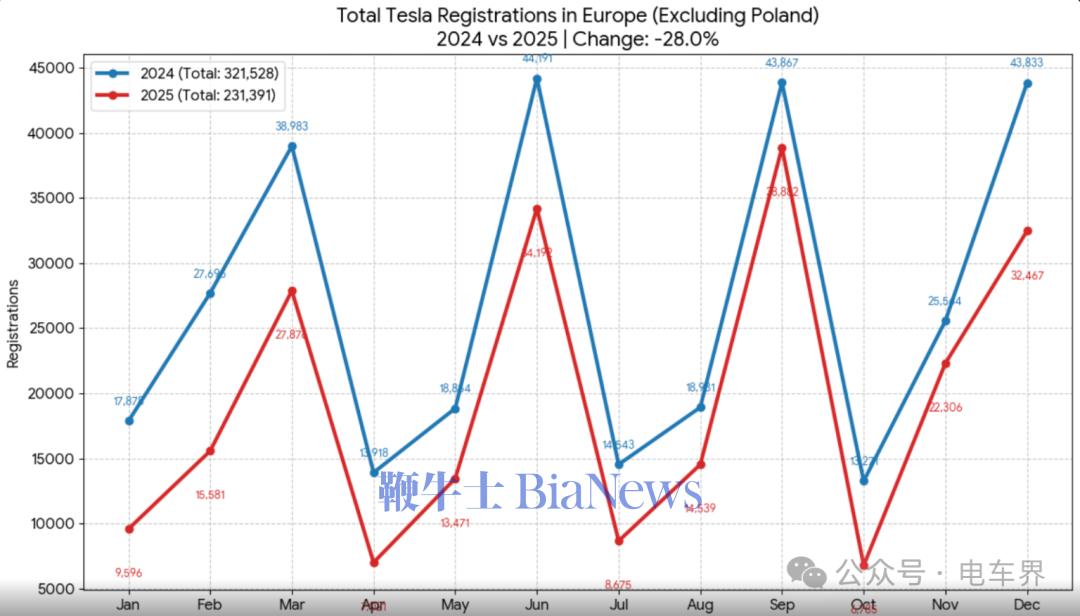 据欧洲主要市场汽车注册量数据统计,特斯拉2025年总销量从2024年的约32.6万辆降至略超23.5万辆,同比暴跌27.8%。