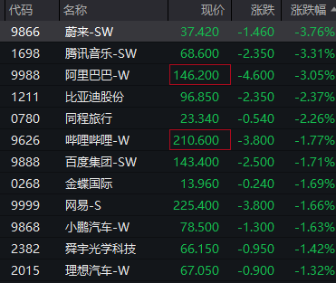 恒生科技指数跌逾1% 蔚来等跌超3%
