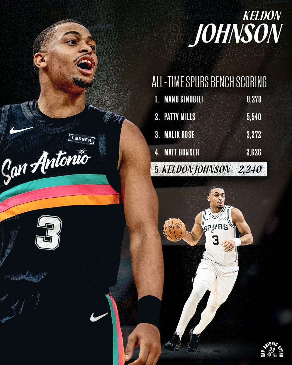 马刺官方推特报道。凯尔登·约翰逊如今升至马刺队史替补得分榜第五位
