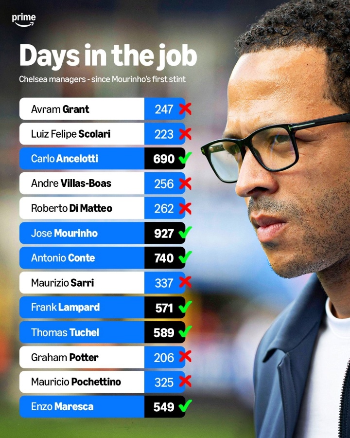 近13位切尔西正式主帅中,超过半数未能执教满1年,穆里尼奥是这期间在任时长最久的主帅。