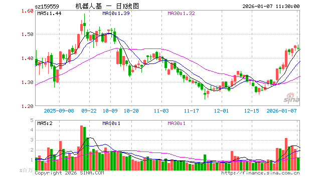 1月7日,截止午间收盘,机器人50ETF(159559)跌0.83%,报1.438元,成交额1.70亿元。机器人50ETF(159559)重仓股方面,双环传动截止午盘跌0.84%,科沃斯跌1.85%,石头科技跌1.44%,绿的谐波跌3.52%,机器人跌1.02%,拓普集团跌1.64%,鸣志电器跌1.06%,埃斯顿涨0.17%,汇川技术跌0.20%,富临精工涨1.12%。