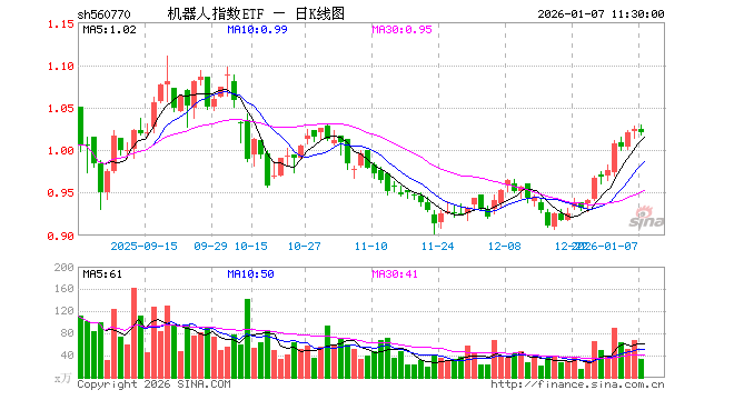1月7日,截止午间收盘,机器人指数ETF(560770)跌0.39%,报1.021元,成交额3500.22万元。机器人指数ETF(560770)重仓股方面,汇川技术截止午盘跌0.20%,科大讯飞跌0.95%,石头科技跌1.44%,大华股份涨0.21%,中控技术涨0.20%,大族激光涨4.09%,机器人跌1.02%,双环传动跌0.84%,科沃斯跌1.85%,云天励飞涨0.05%。