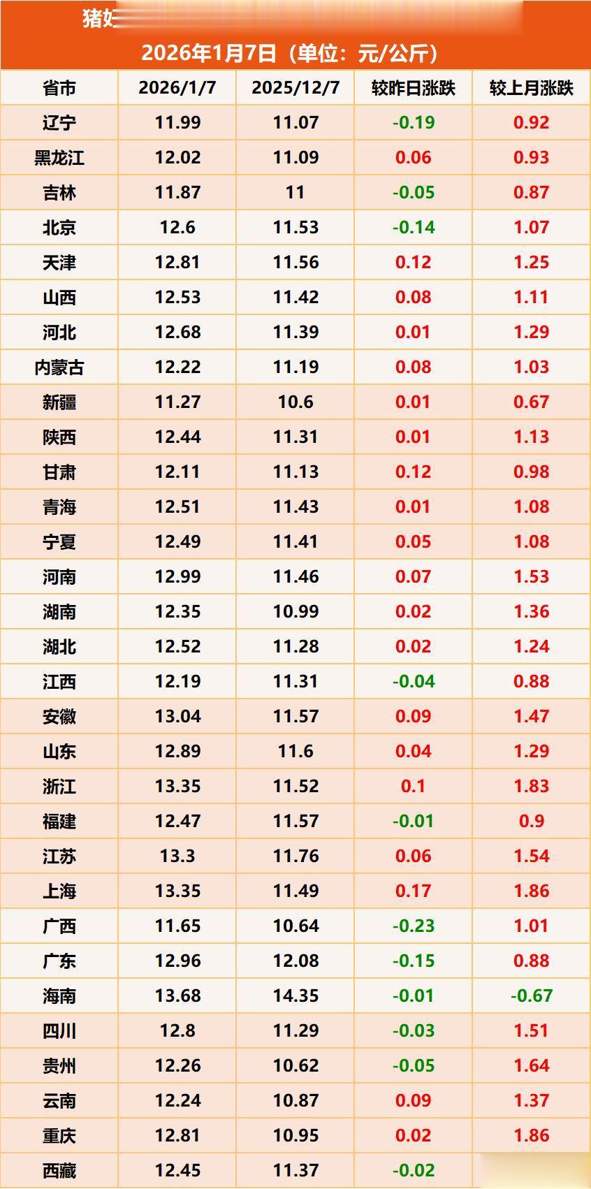 步步高升!生猪价格延续昨日涨势,猪价行情重心持续上移!据猪好多数据监测显示,2026年1月7日全国外三元生猪均价为12.52元/公斤,较昨日上涨0.03元/公斤。当前生猪市场呈现明显回暖态势,国家发改委最新数据也带来积极信号,生猪养殖头均亏损缩减至212.26元,较前一周减亏48.69元每头。