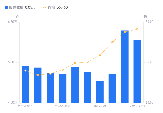 日期A股户数(户)流通A股户均持股数(股)户均持股市值(万元)2025-12-28605004282.9823.752025-11-30629004119.5622.152025-10-31520004983.0823.662025-09-30504135139.9520.222025-08-31526004926.2417.392025-07-31538004816.3616.622025-06-30522054963.5115.132025-05-31523004954.5013.842025-04-30537004825.3313.042025-03-31541614784.2614.28