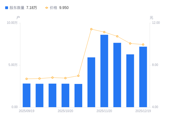 近一年(2024年12月20日至2025年12月19日),摩恩电气A股股东户数从3.37万户,增加至7.18万户,增幅112.93%,区间股价上涨38.97%。