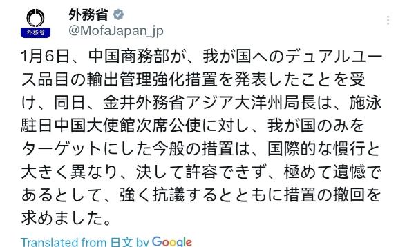 日本出来回应了, 1月7日,日本外务省声称,1月6日,中国商务部宣布强化对日本两用物品的出口管制措施。同日,日本外务省亚洲大洋洲局局长金井向中国驻日大使馆公使衔参赞提出强烈抗议,称此次专门针对日本的管制措施与国际通行惯例严重不符,完全不可接受,对此深表遗憾,并要求中方撤回该措施。 从日本官方这番措辞激烈、姿态强硬的表态中,不难看出北京的这一记反制拳,确实打得又准又狠。 日本方面抛出的那顶“不符国际通行惯例”的大帽子,试图将自己包装成规则的受害者,并将中方描绘成破坏秩序的一方,然而,这种颠倒黑白的说法,根本经不起推敲。 中国的出手不仅名正言顺,更是对战后国际秩序的一种必要维护,日本的愤怒抗议,反而更像是被人戳到痛处后的恼羞成怒。 日本作为一个二战战败国的特殊身份,战后国际社会为防止军国主义思想死灰复燃,对日本的军事发展作出了严格的限制性安排,这才是真正意义上需要被遵守的“国际惯例”。 中国作为负责任的大国,对可能被转用于军事领域的两用物项进行出口管制,正是为了确保日本无法轻易突破这一历史束缚,其目的在于削弱其军事工业潜力,防范其重走历史的老路。因此,中方的管制行动,恰恰是在履行维护地区和平稳定的国际责任。 中方的反制并非心血来潮,而是日本一系列挑衅行为累积下的必然结果,近段时间以来,日本在中国的核心利益问题上动作频频,尤其是在台湾问题上,不断做出危险的试探。 从高市早苗这类政客屡次发表的恶劣言论,到日本议员团体接二连三地窜访台湾,这些举动都在公然挑战中国的主权红线,严重侵蚀了中日关系的政治基础。 中方此前展现的战略耐心显然被日方误读为软弱,他们似乎认为可以无休止地在中国的底线上进行危险试探,而不必承担任何后果,当善意的提醒和严正的警告都宣告无效后,采取实质性的反制措施就成了唯一的选择。 所以,日本如今的局面,完全是其自身错误行径所导致的,纯属自作自受。现在日方高喊“完全不可接受”,并要求中方撤回管制,这种逻辑显得十分苍白无力。 他们需要反躬自省的是,那些伤害中国人民感情的恶劣言论是否已经收回?那些干涉中国内政的错误行径是否已经停止?如果挑衅在先的行为没有得到纠正,又有什么资格要求对方撤回正当的防卫反制? 在这个原则性问题上,中方不可能有任何妥协的余地,撤回措施更是无从谈起。解决问题的钥匙,始终握在日本自己手中,那就是彻底改弦更张,以实际行动来修正自己的错误。