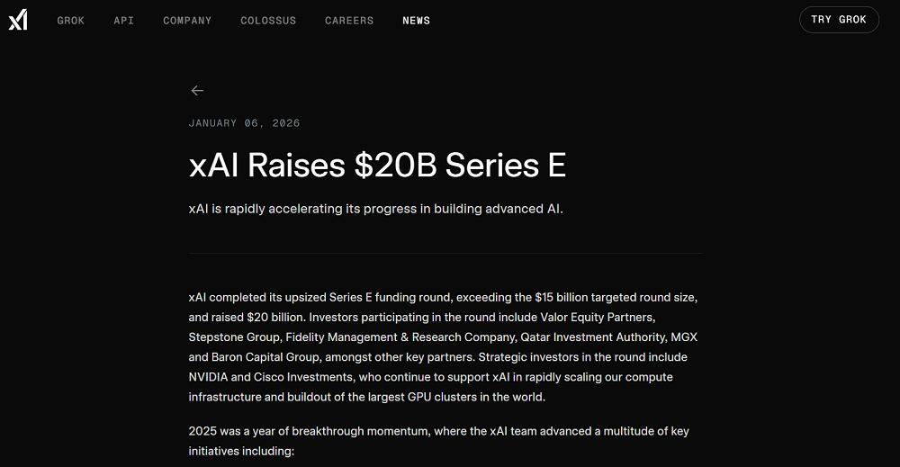 智东西1月7日报道,今天,马斯克旗下AI创企xAI宣布,已经完成规模200亿美元(约合人民币1396.8亿元)的E轮融资。本轮融资获得超额认购,远远超过原定的150亿美元目标。