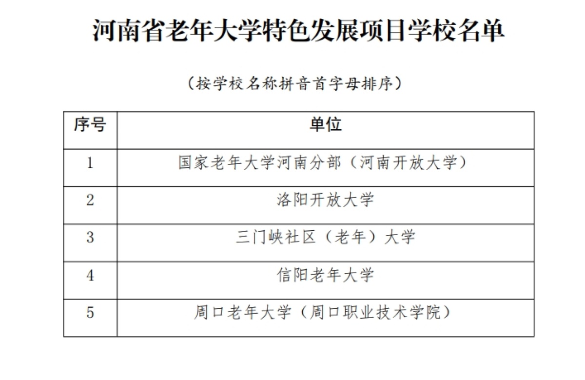 近日,河南省教育厅公布河南省老年大学特色发展项目学校名单,共有5所学校入选。