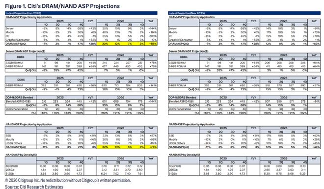 花旗研究团队在最新报告中明确指出,预计2026年商品存储器市场将出现“严重的供应短缺”。这种短缺并非暂时性的供应链扰动,而是由结构性数据增长驱动的。花旗将2026年DRAM(动态随机存取存储器)的平均售价(ASP)同比增速预期从之前的+53%大幅上调至+88%。