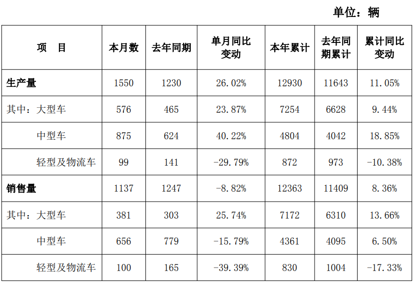 销售量方面,12月份销售1137辆,同比减少8.82%;本年累计销售量为1.24万辆,同比增长8.36%。具体数据如下: