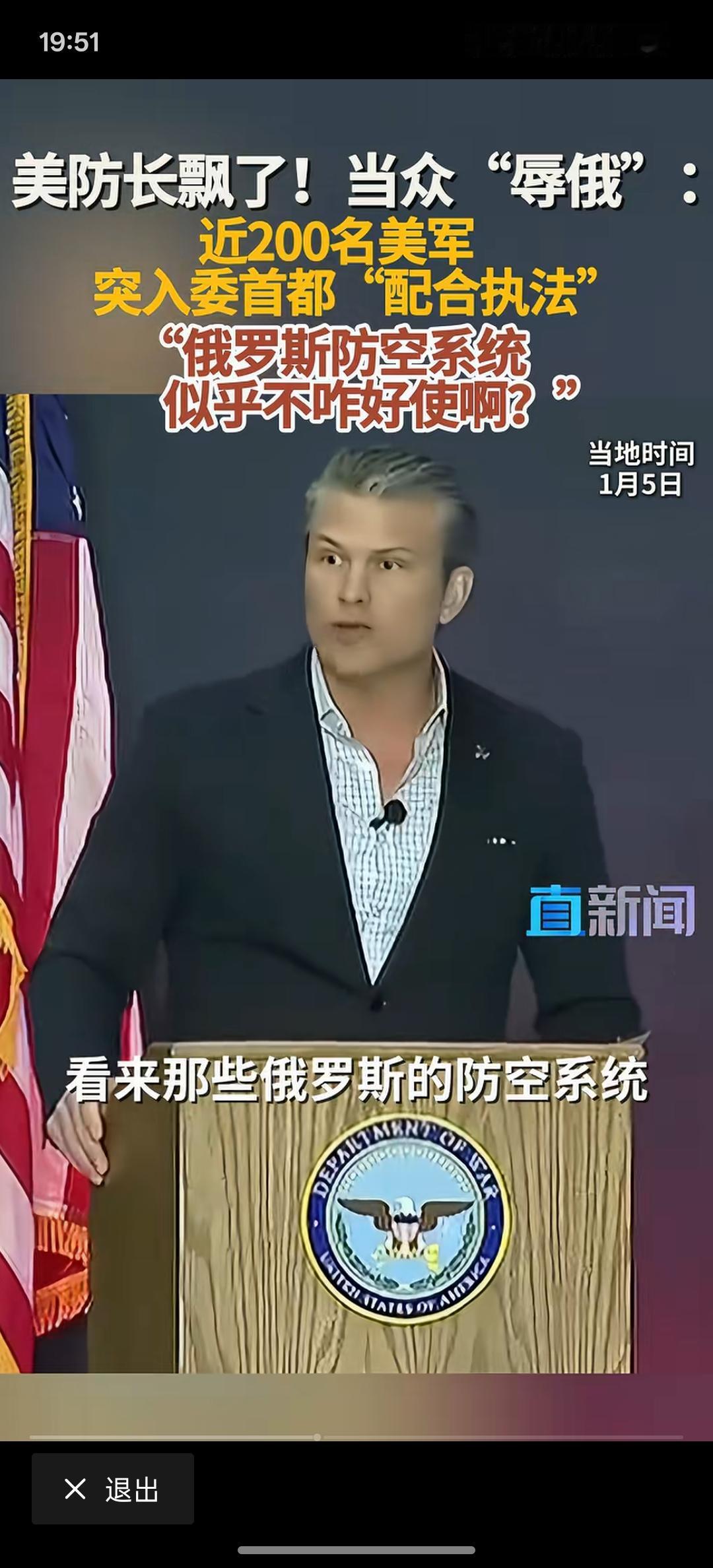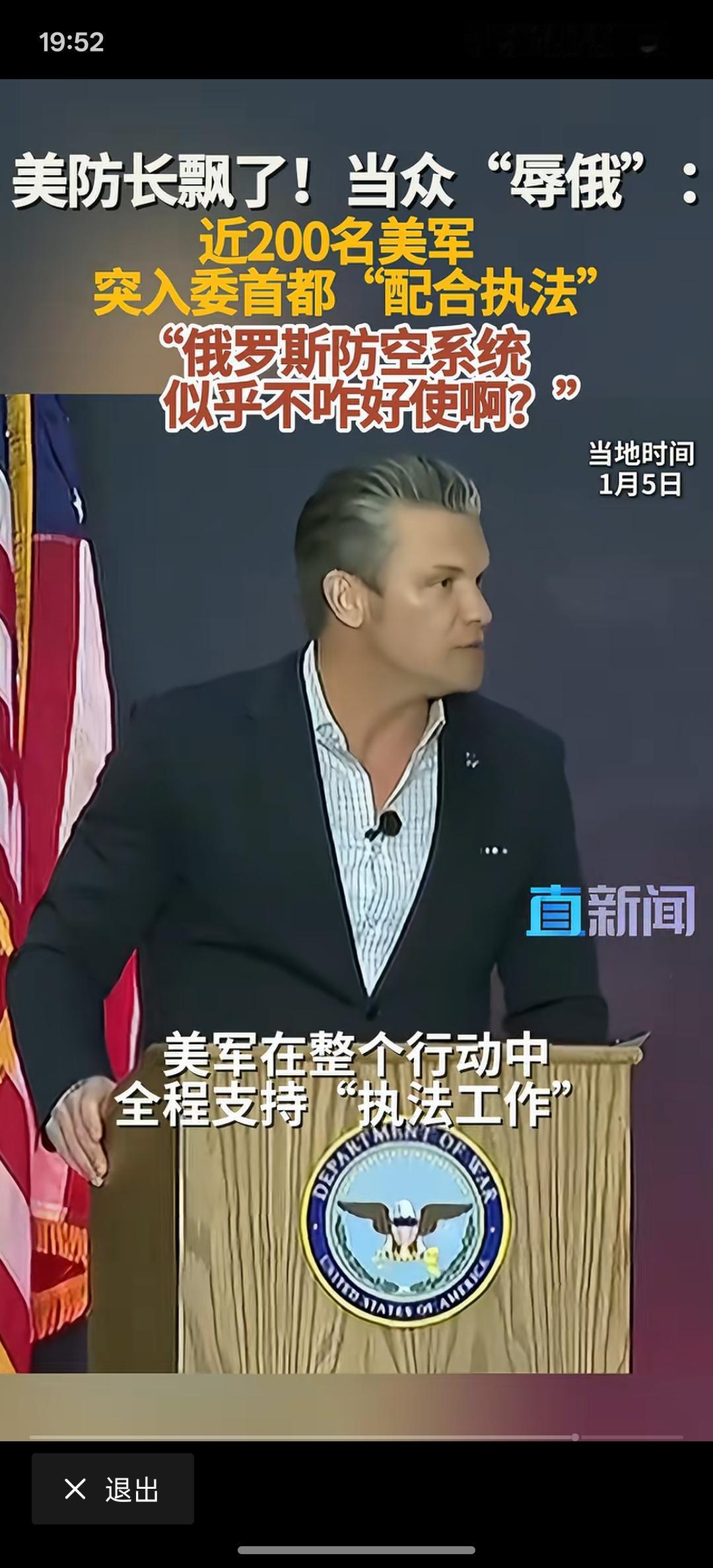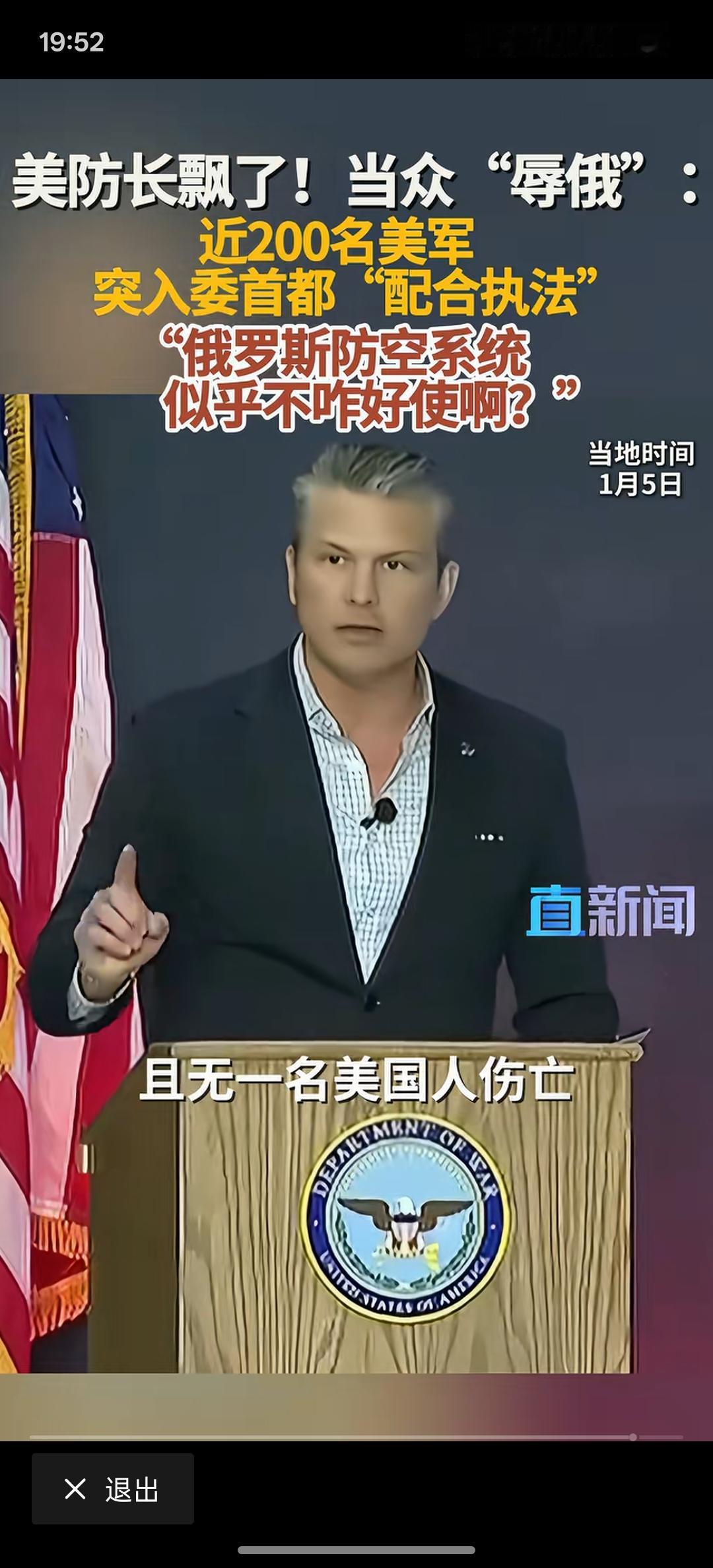 美国国防部长飘了,“辱俄”,说俄罗斯的防空系统不好使!近200名美国士兵在委内瑞拉进行抓捕委内瑞拉总统马杜罗,俄罗斯的防空系统没有击落美军的军机,200名最优秀的美军进入市区执行任务,俄罗斯的航空系统并不那么好使用!所以到现在也有很多疑问,为什么委内瑞拉的防空系统没有对美军直升机以及武装直升机进行拦截袭击!或许美国真的用了电子干扰者助战! 也确实,美军在这一次行动当中,只有一人伤亡,委内瑞拉死伤人数接近30名保卫人员!