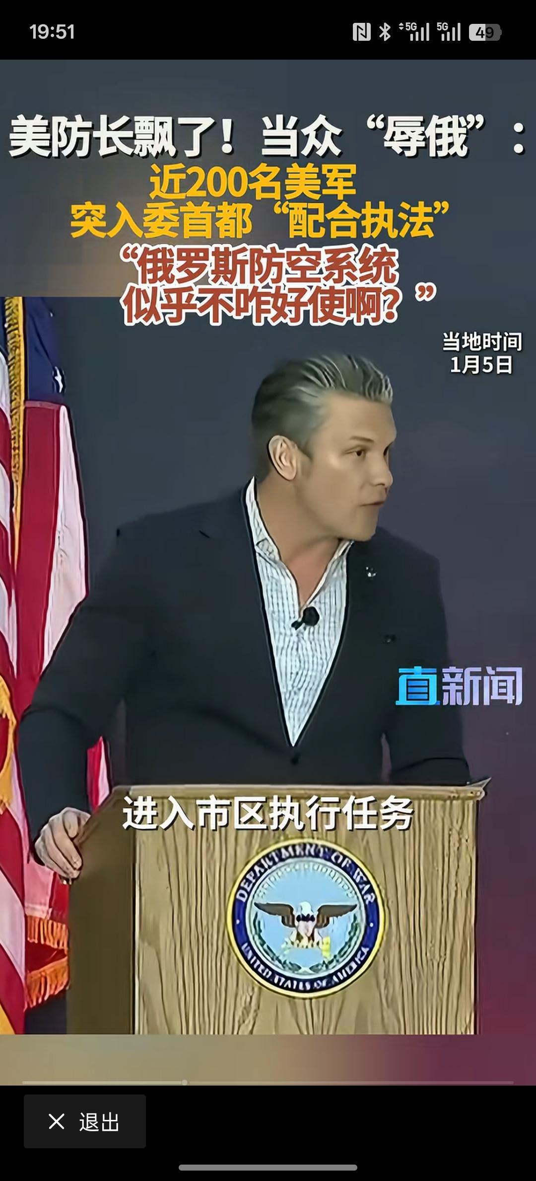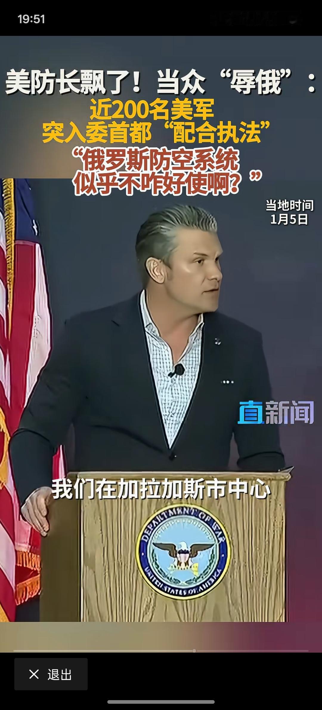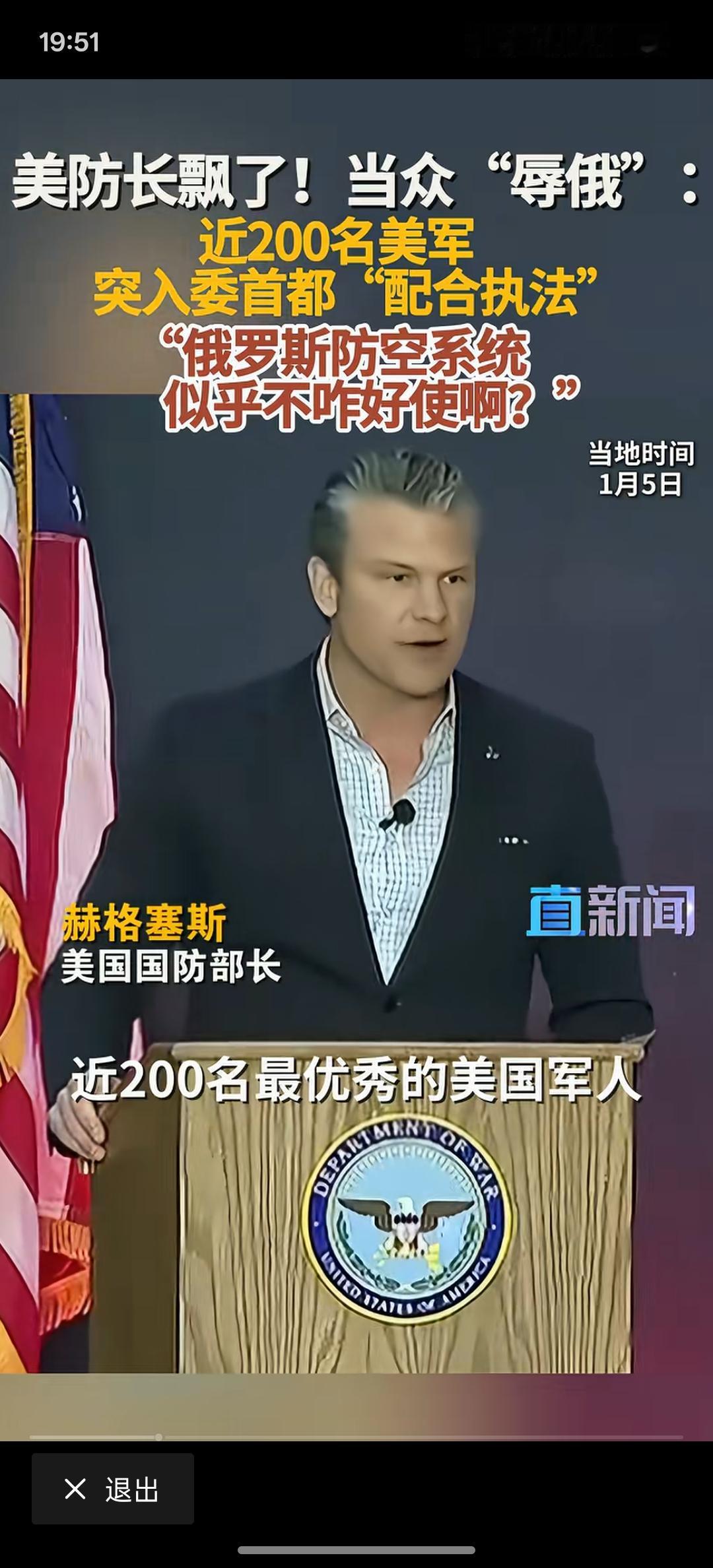 美国国防部长飘了,“辱俄”,说俄罗斯的防空系统不好使!近200名美国士兵在委内瑞拉进行抓捕委内瑞拉总统马杜罗,俄罗斯的防空系统没有击落美军的军机,200名最优秀的美军进入市区执行任务,俄罗斯的航空系统并不那么好使用!所以到现在也有很多疑问,为什么委内瑞拉的防空系统没有对美军直升机以及武装直升机进行拦截袭击!或许美国真的用了电子干扰者助战! 也确实,美军在这一次行动当中,只有一人伤亡,委内瑞拉死伤人数接近30名保卫人员!