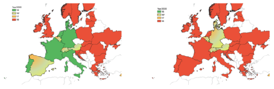 下图中,左面是2000年欧洲各国的最低饮酒年龄,右边为2020年的饮酒年龄规定,红色为18岁,绿色为16岁。