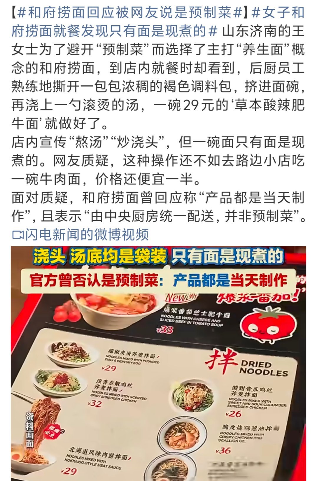 和府捞面 只有面现煮其实大家心知肚明,它店里肉之类的不可能是现煮的,我是偶尔会吃一次的,主要是图个方便!其实和西贝一样,都是中央厨房出来的东西,即便是只有面现煮你也不能说它是预制菜,介意的不吃就行了,没必要纠结~