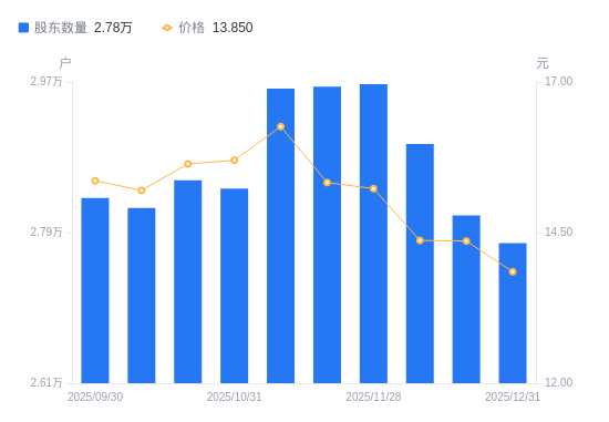 日期A股户数(户)流通A股户均持股数(股)户均持股市值(万元)2025-12-31277759545.7813.222025-12-19281059433.7013.552025-12-10289609155.1813.162025-11-28296728935.5013.612025-11-20296458943.6413.712025-11-10296208951.1814.552025-10-31284269327.1714.642025-10-20285259294.8014.542025-10-10281939404.2514.292025-09-30283159363.7314.38